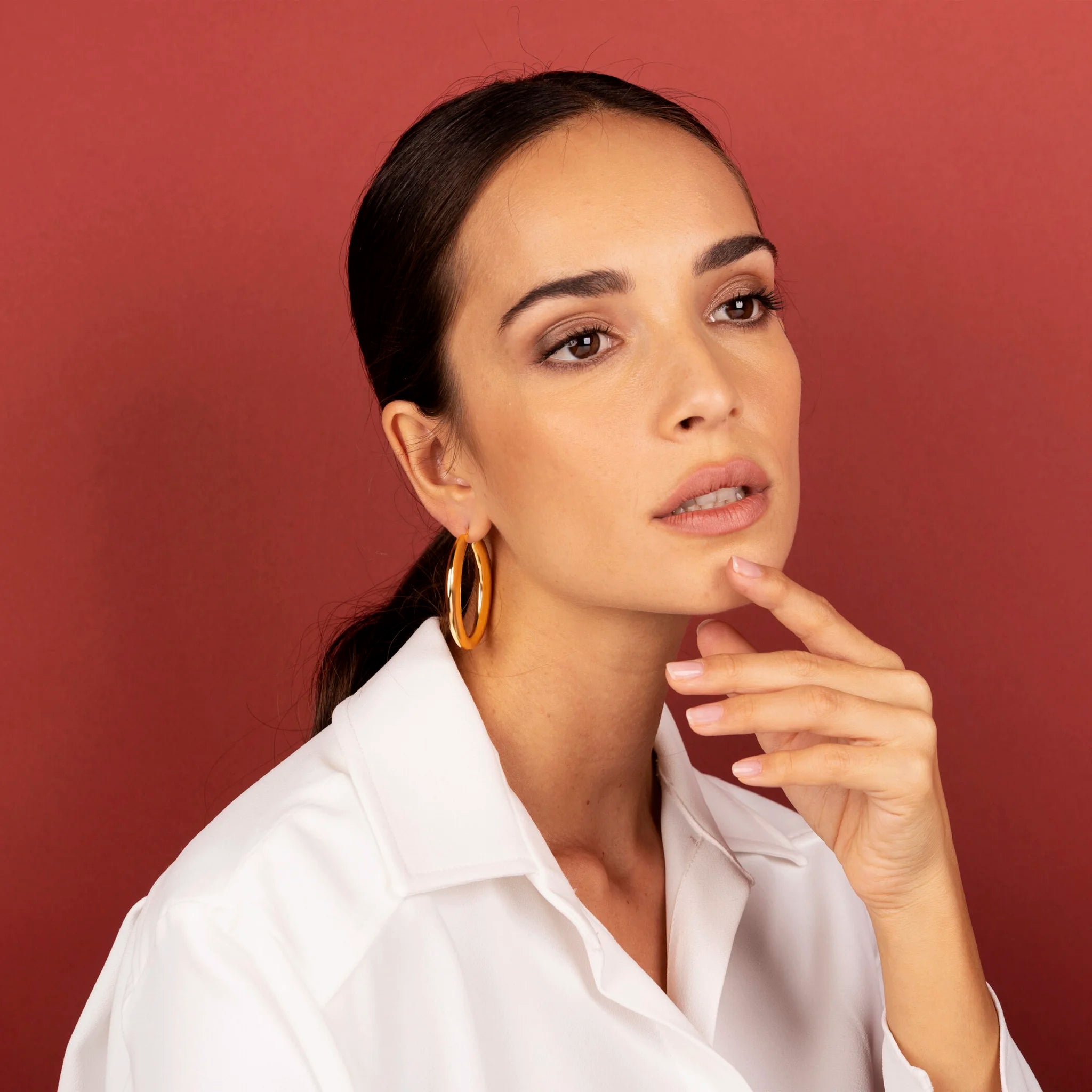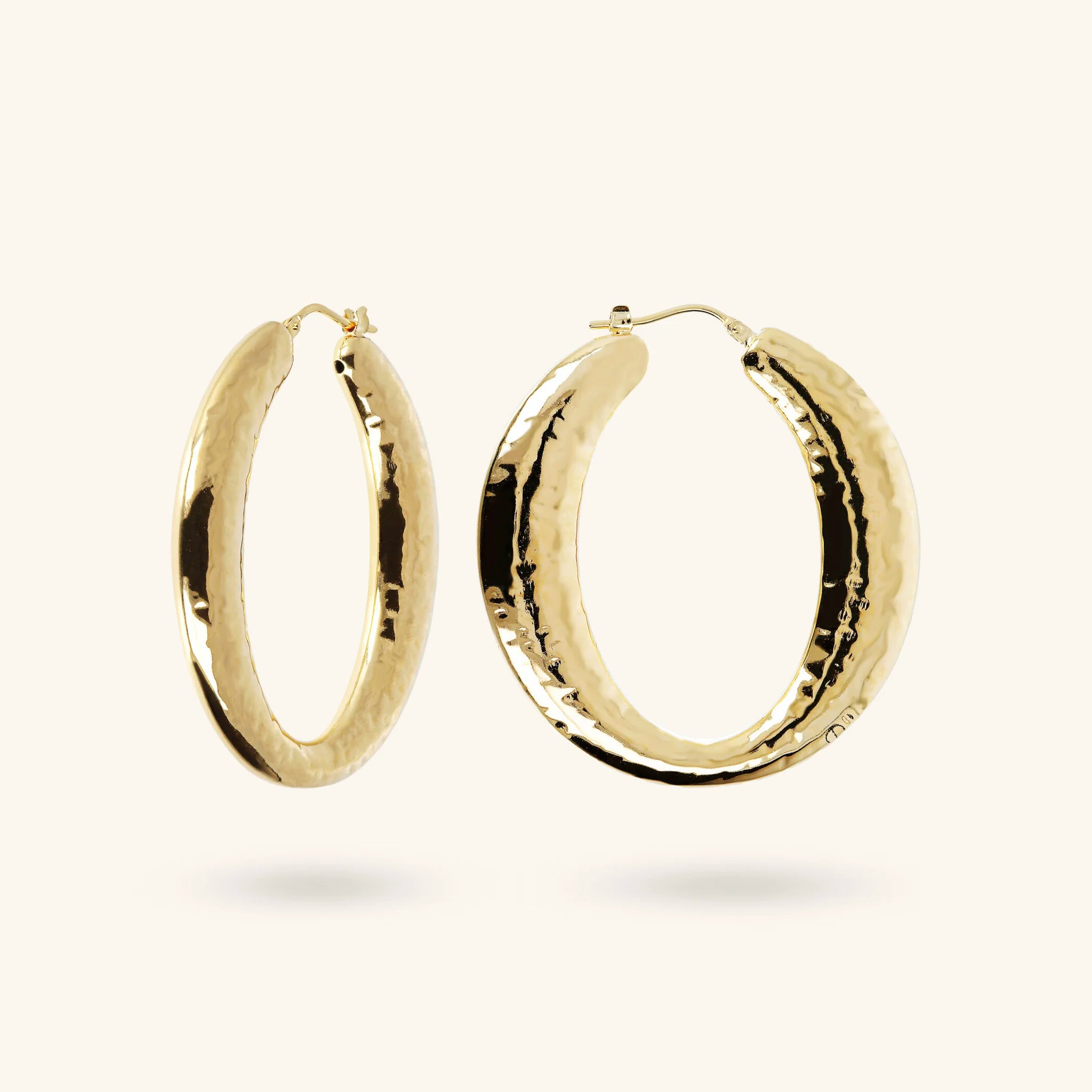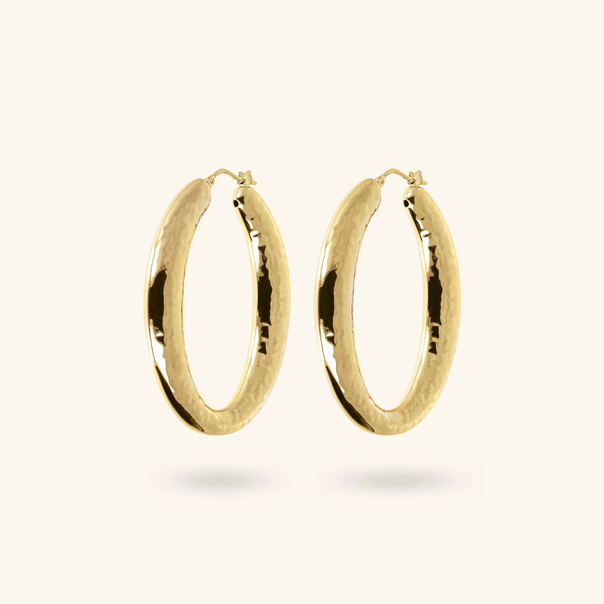 Orecchini pendenti a cerchio Etrusca Gioielli realizzati in lega Golden, placcata oro giallo 18kt, con forma ovale e superficie martellata; chiusura a baionetta; lunghezza di 4.7 cm.