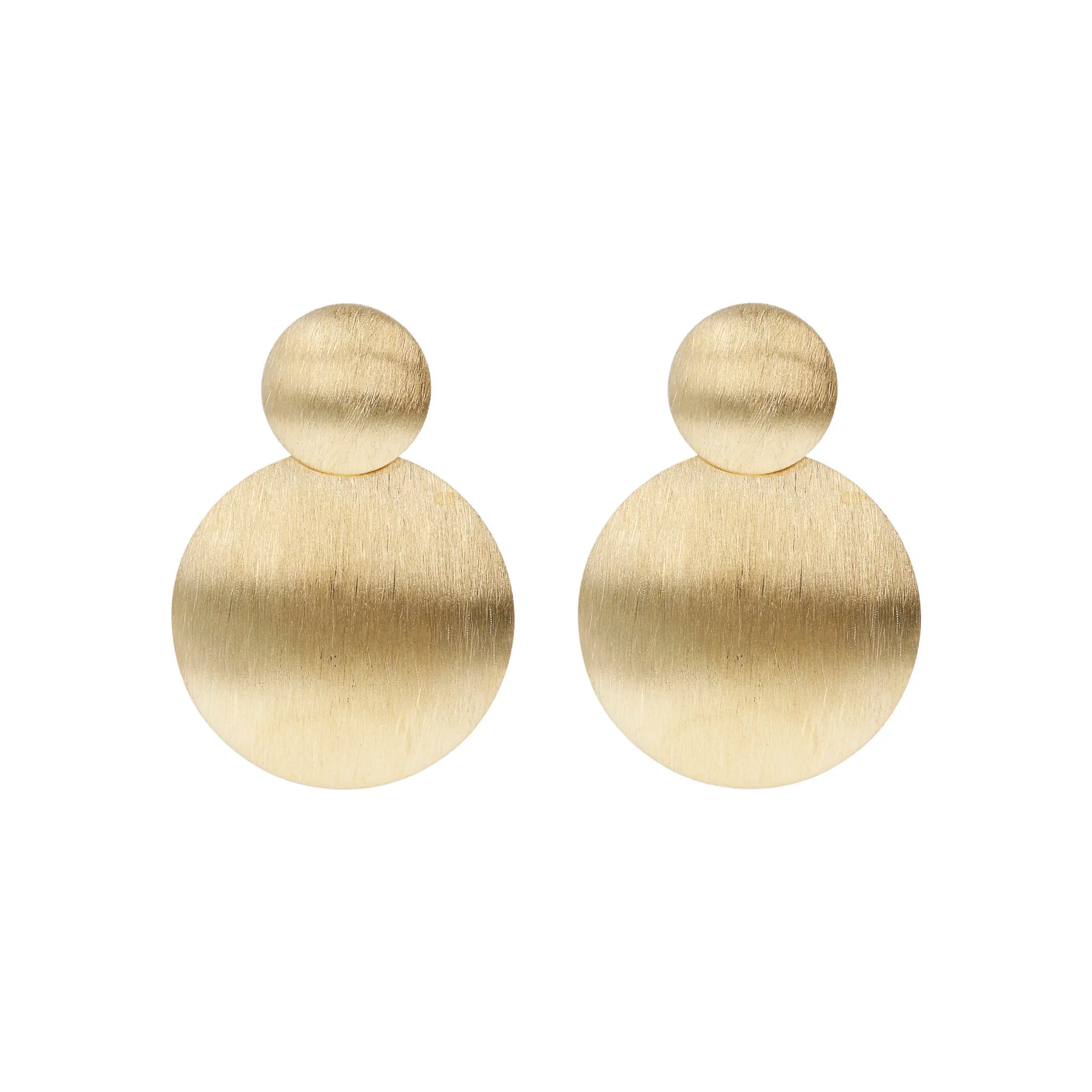Orecchini pendenti Etrusca Gioielli realizzati in lega Golden, placcata Oro giallo 18kt, con doppio disco dalla superficie satinata. Chiusura a perno e farfalla. Lunghezza 3.2 cm.