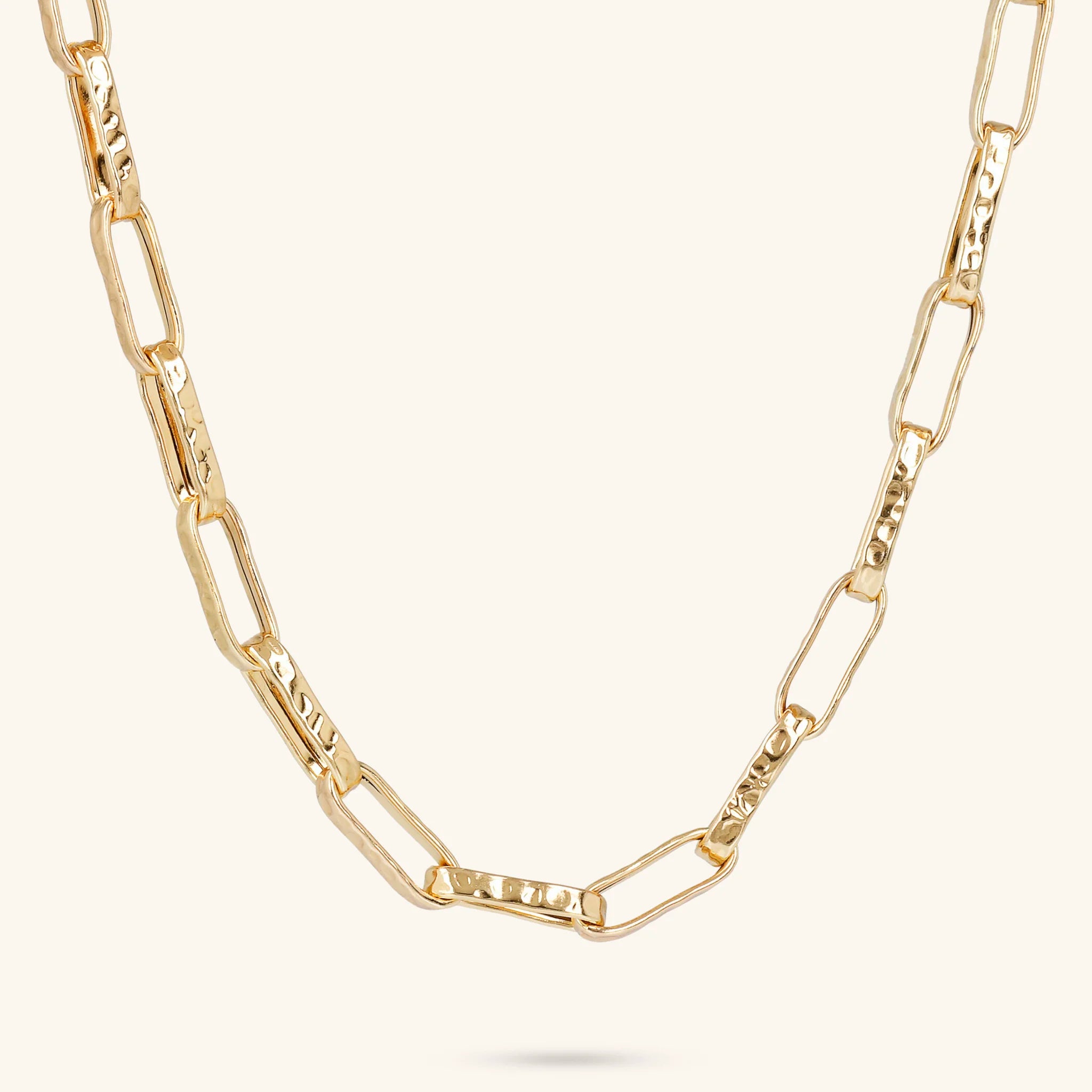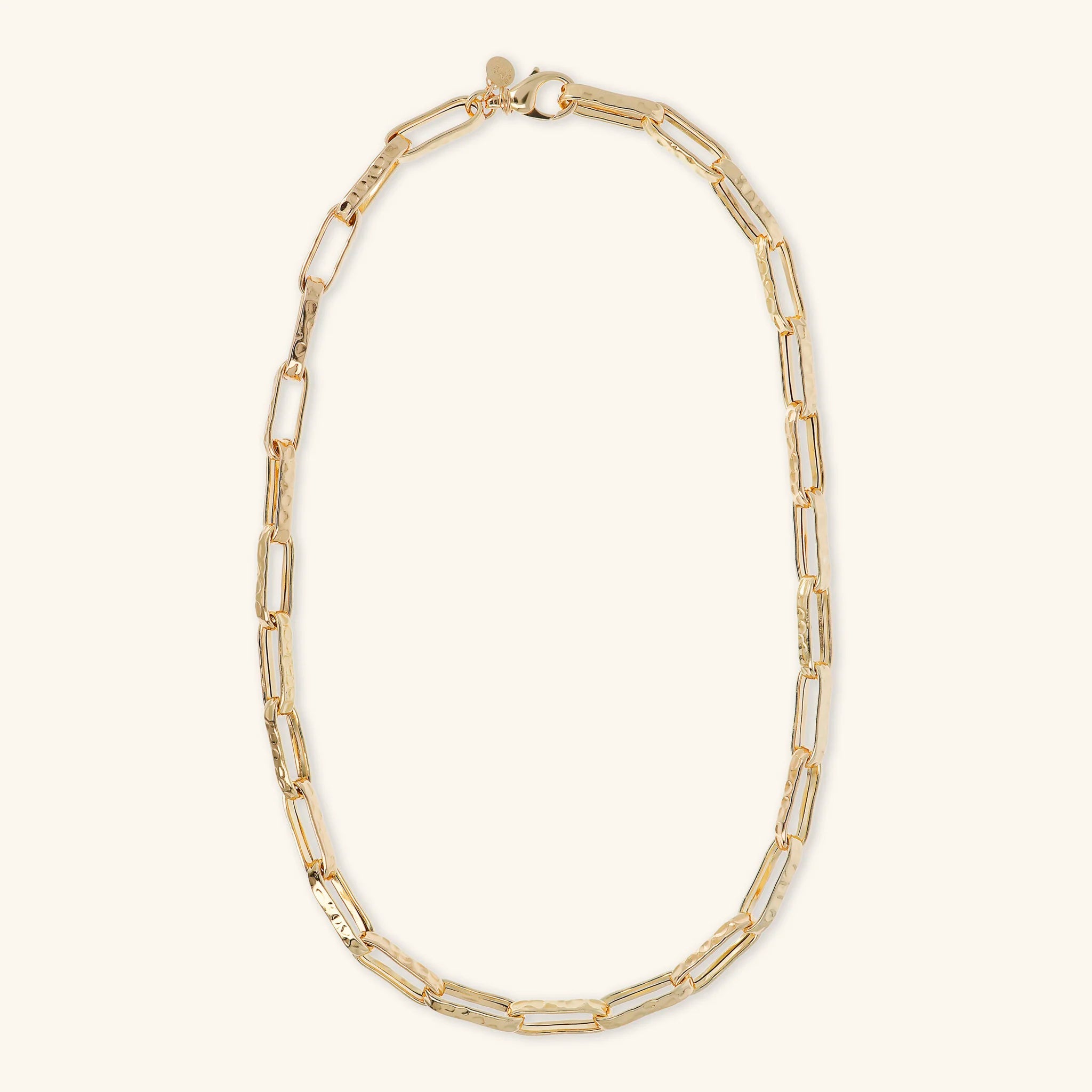 Collana matinée Etrusca Gioielli realizzata in lega Golden, placcata oro giallo 18kt, impreziosita da una catena forzatina allungata paperclip con superficie martellata; chiusura a moschettone.