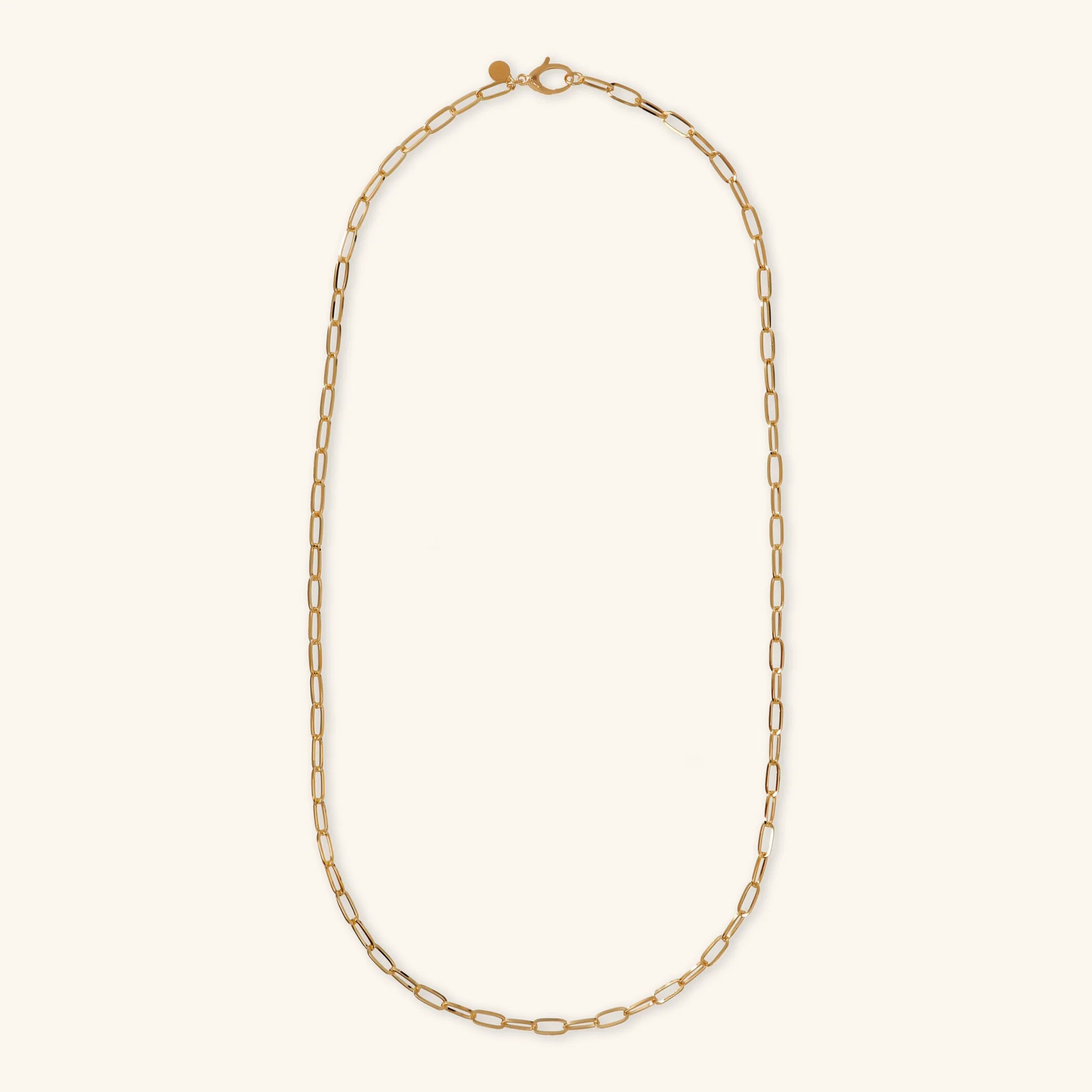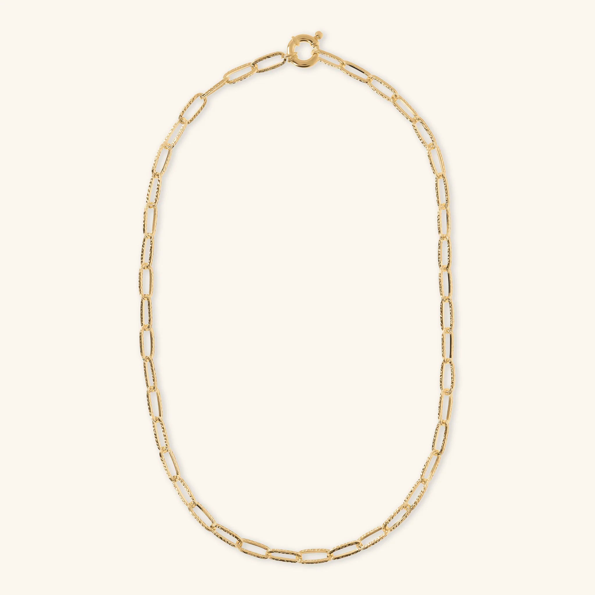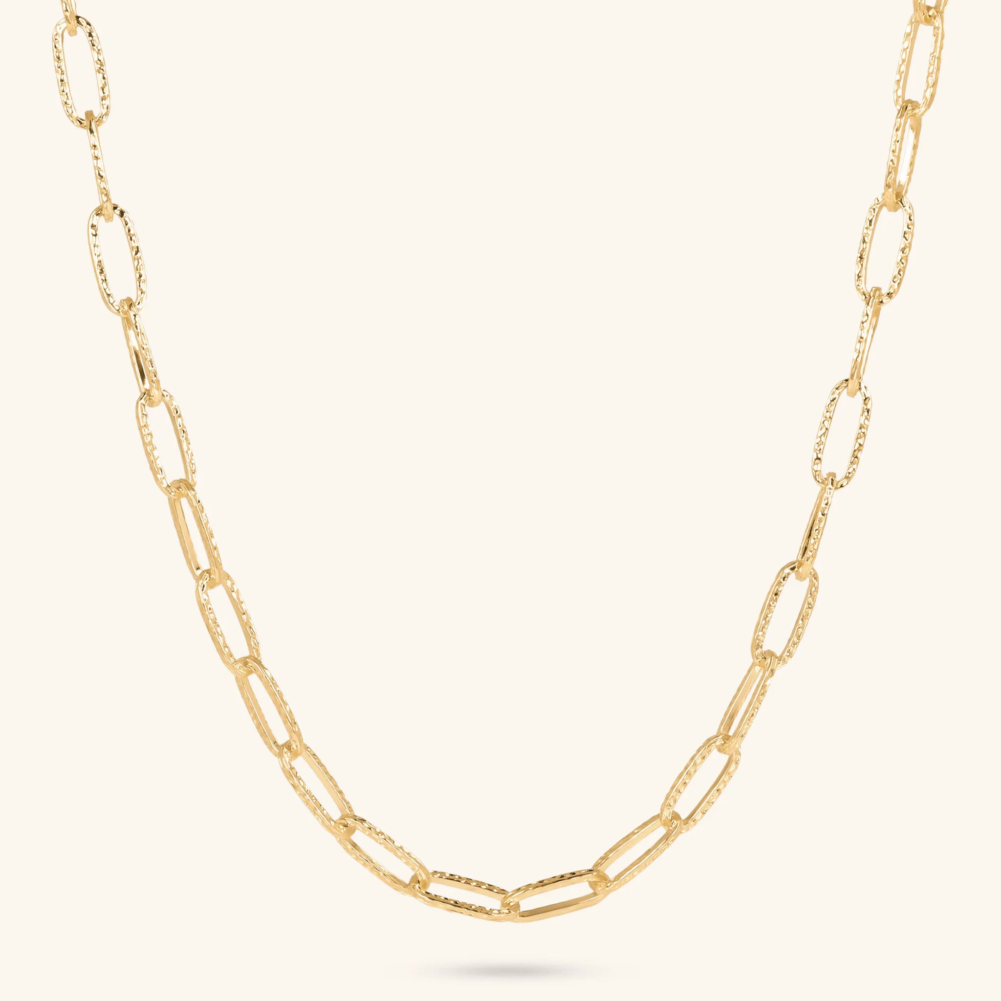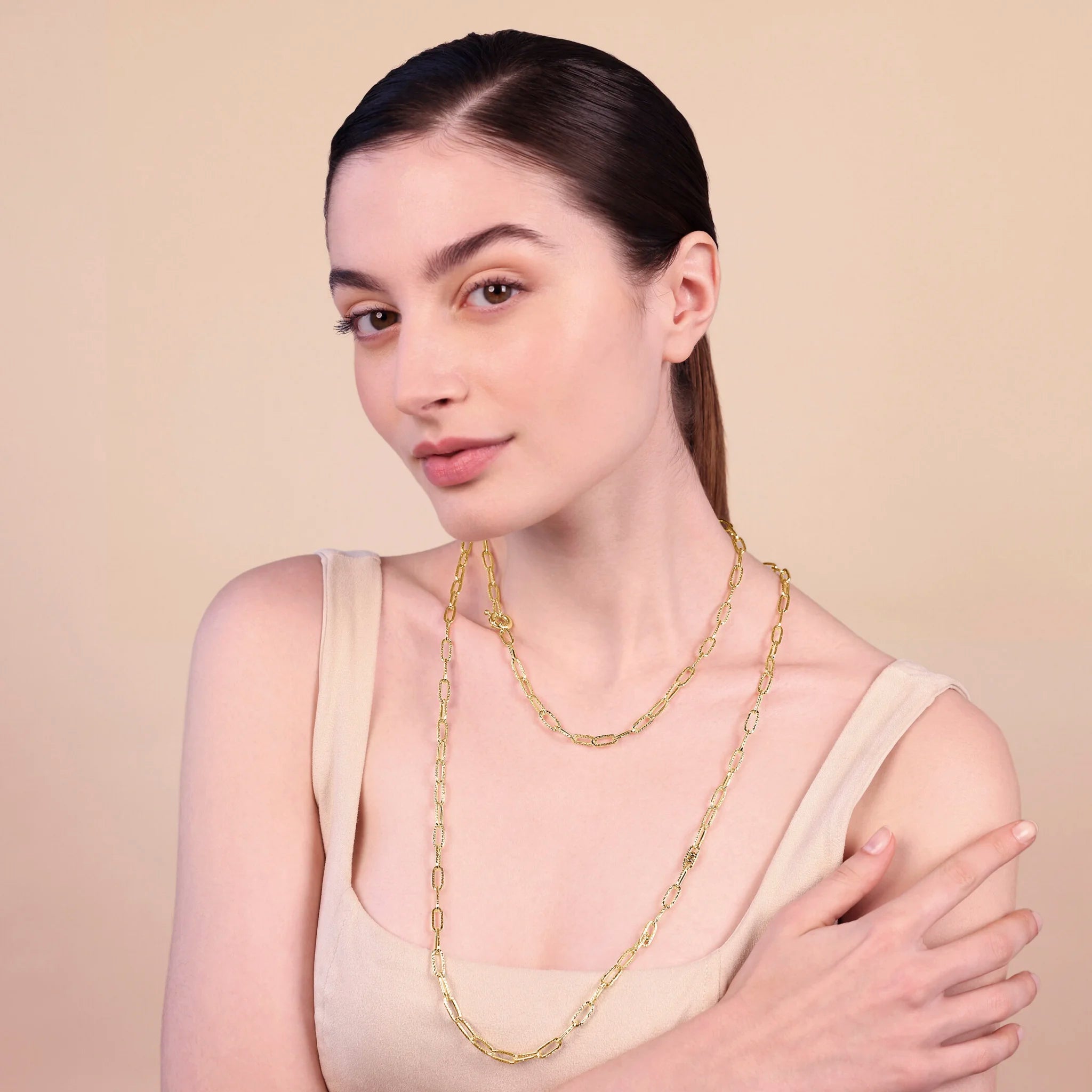 Collana Etrusca Gioielli realizzata in lega Golden, placcata oro giallo 18kt, impreziosita da maglie ovali allungate paperclip dalla superficie martellata; chiusura a moschettone. Disponibile in due misure: short (45.7 cm) e long (81.3 cm).
