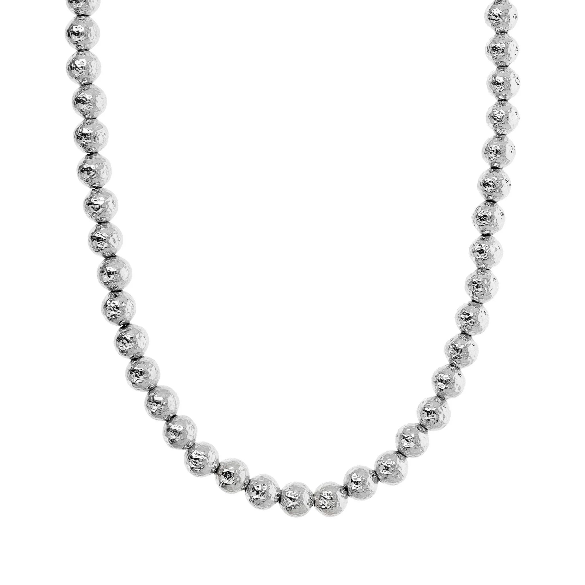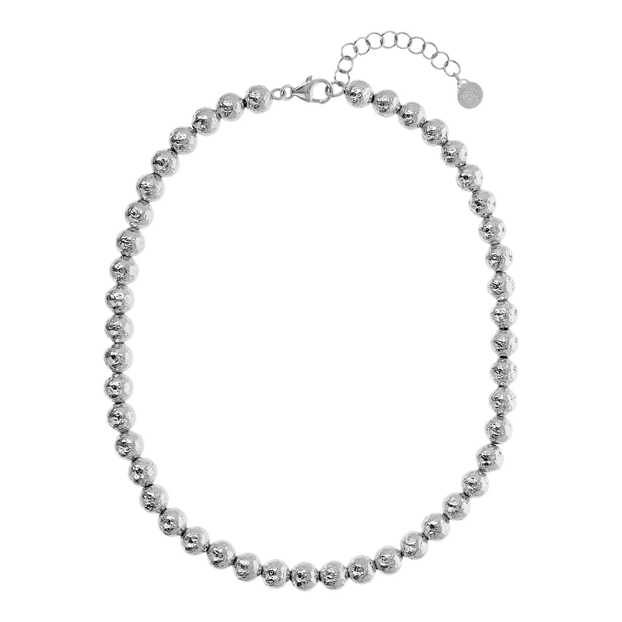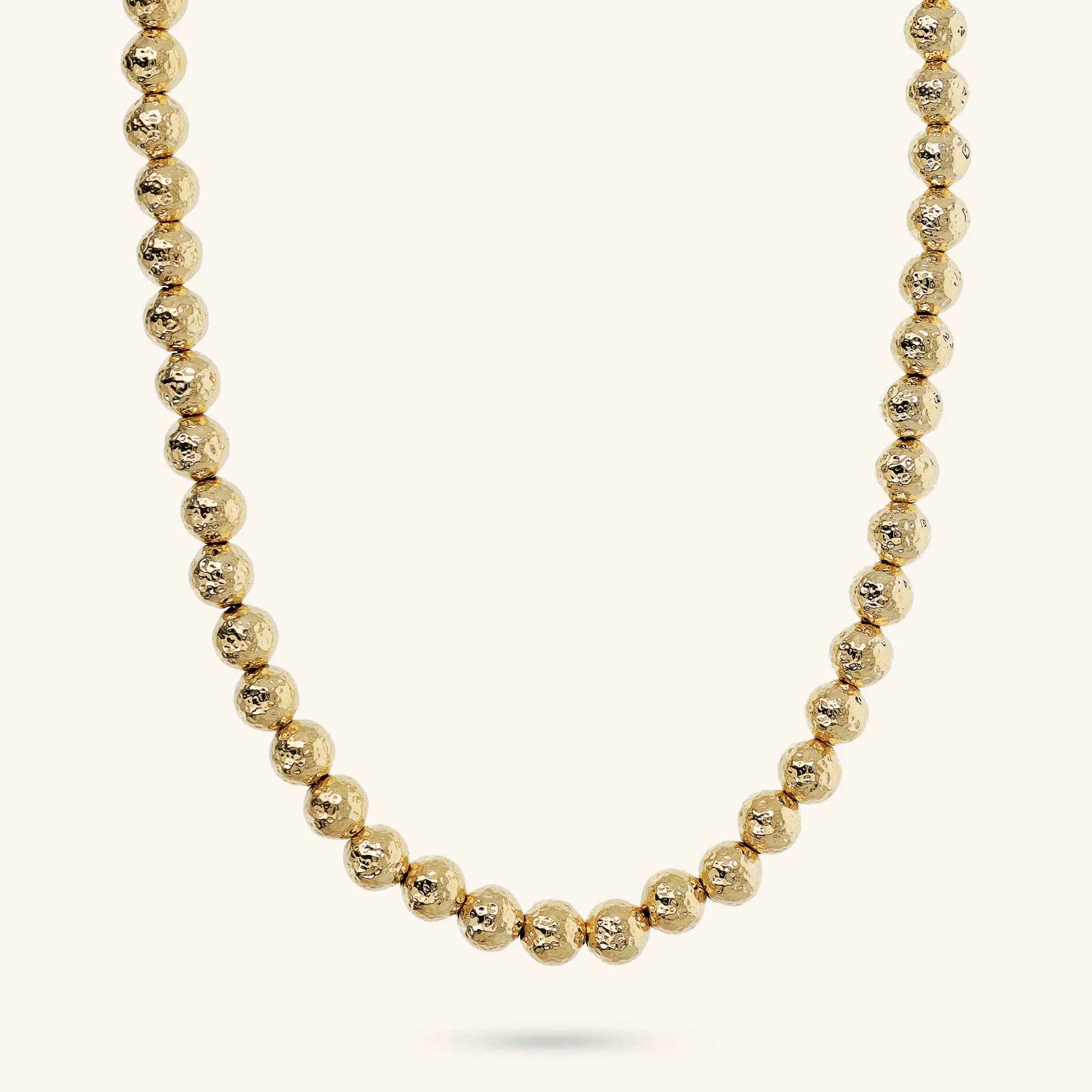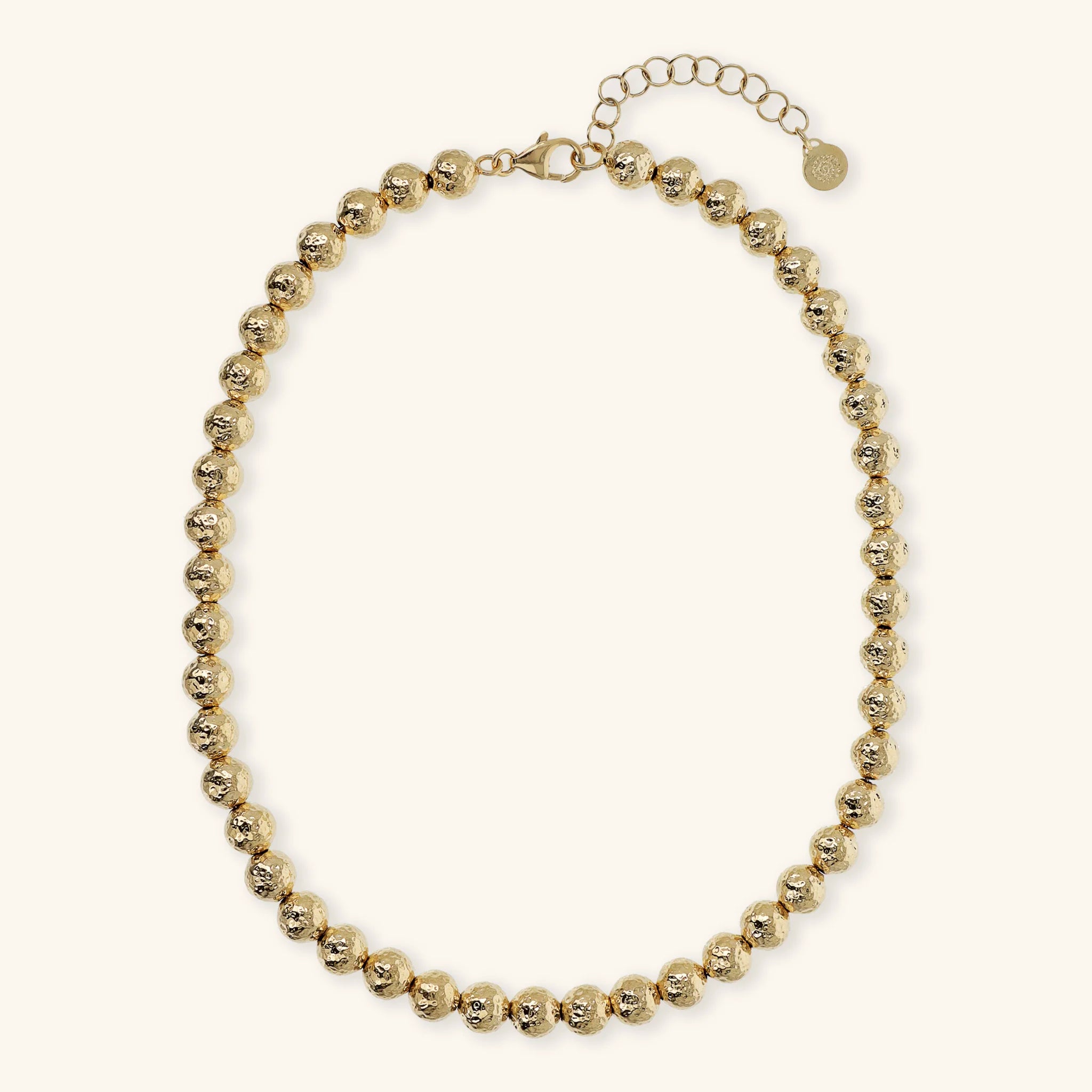 Collana girocollo realizzata in lega Golden, placcata oro giallo 18kt, impreziosita da sfere (8 mm) con superficie martellata. Chiusura a moschettone.
