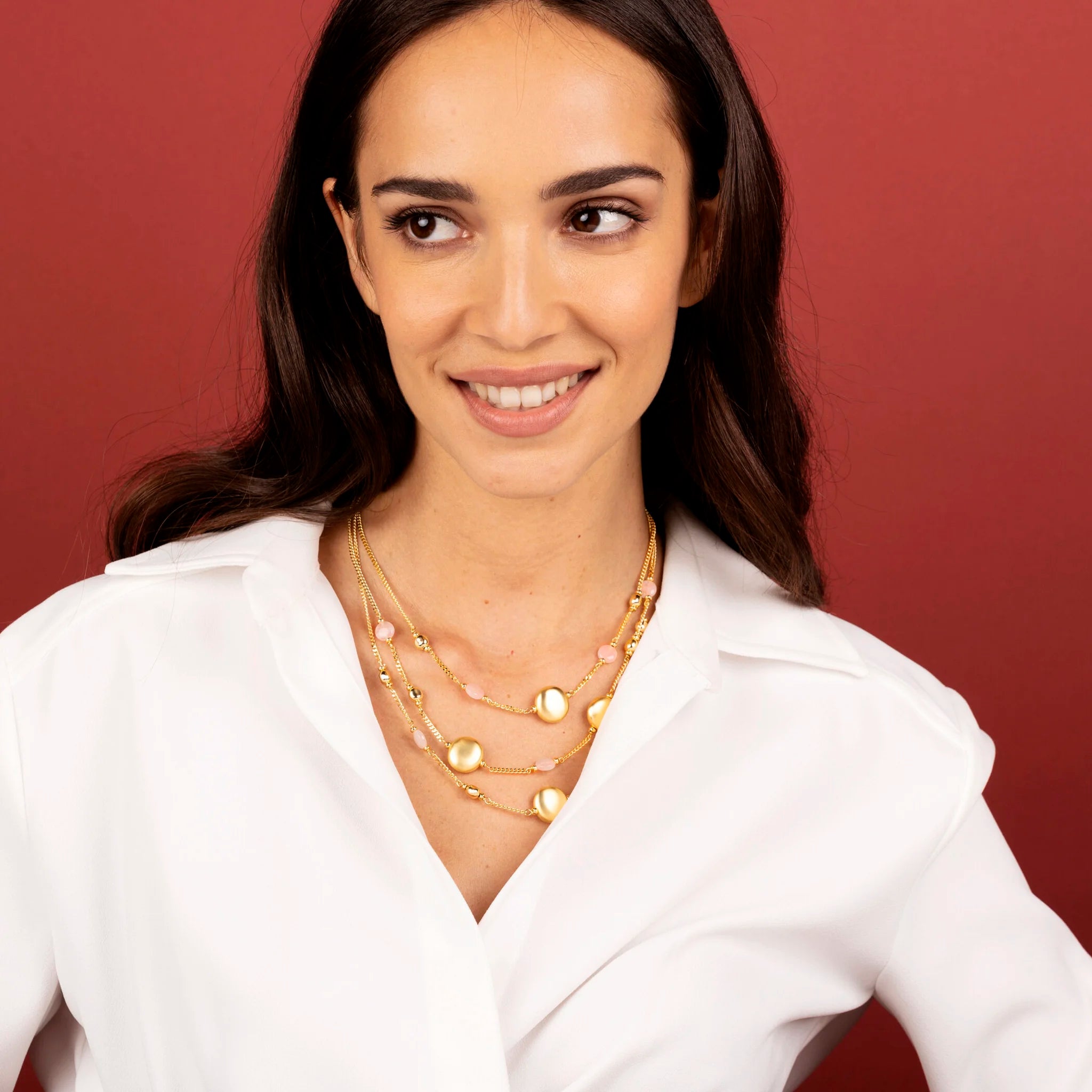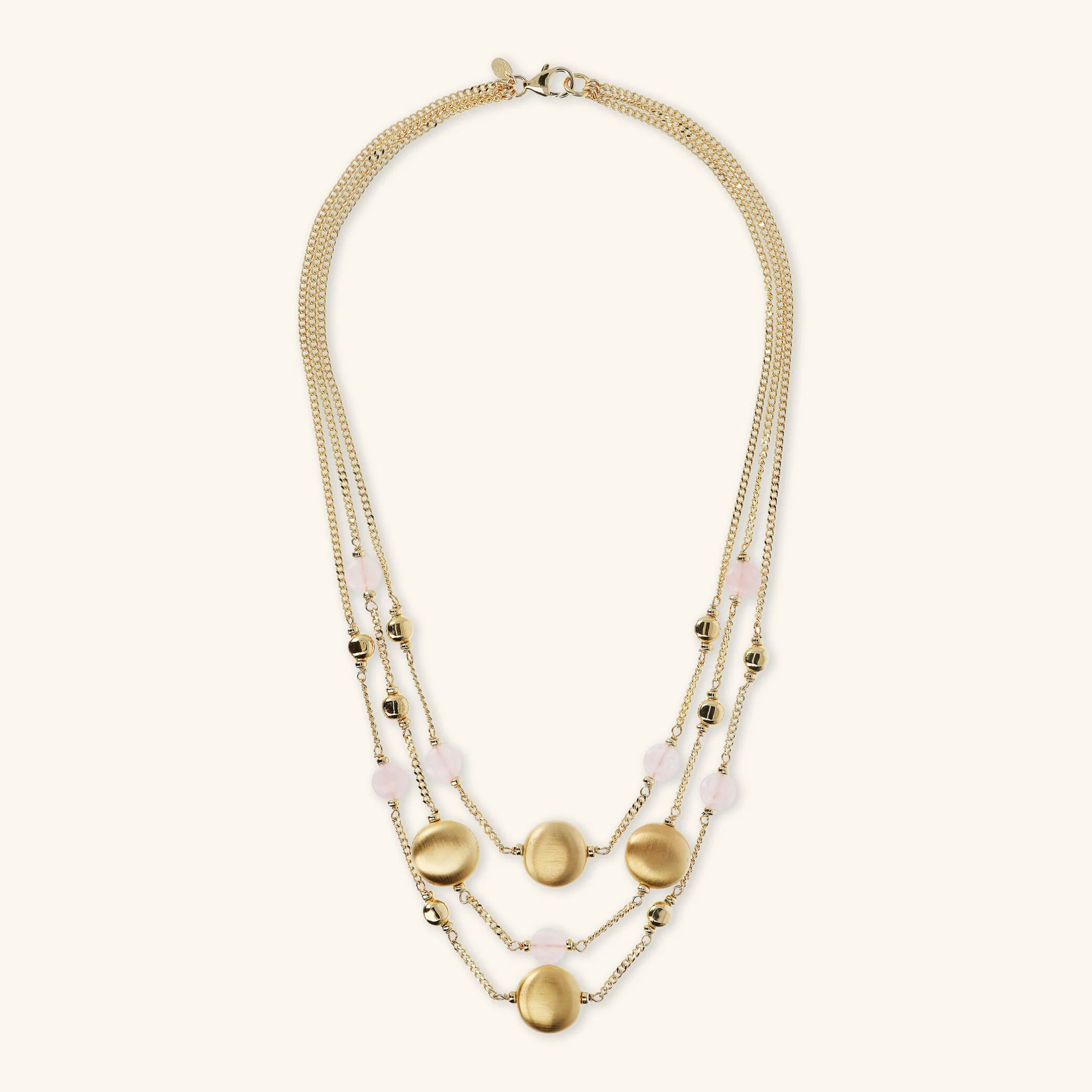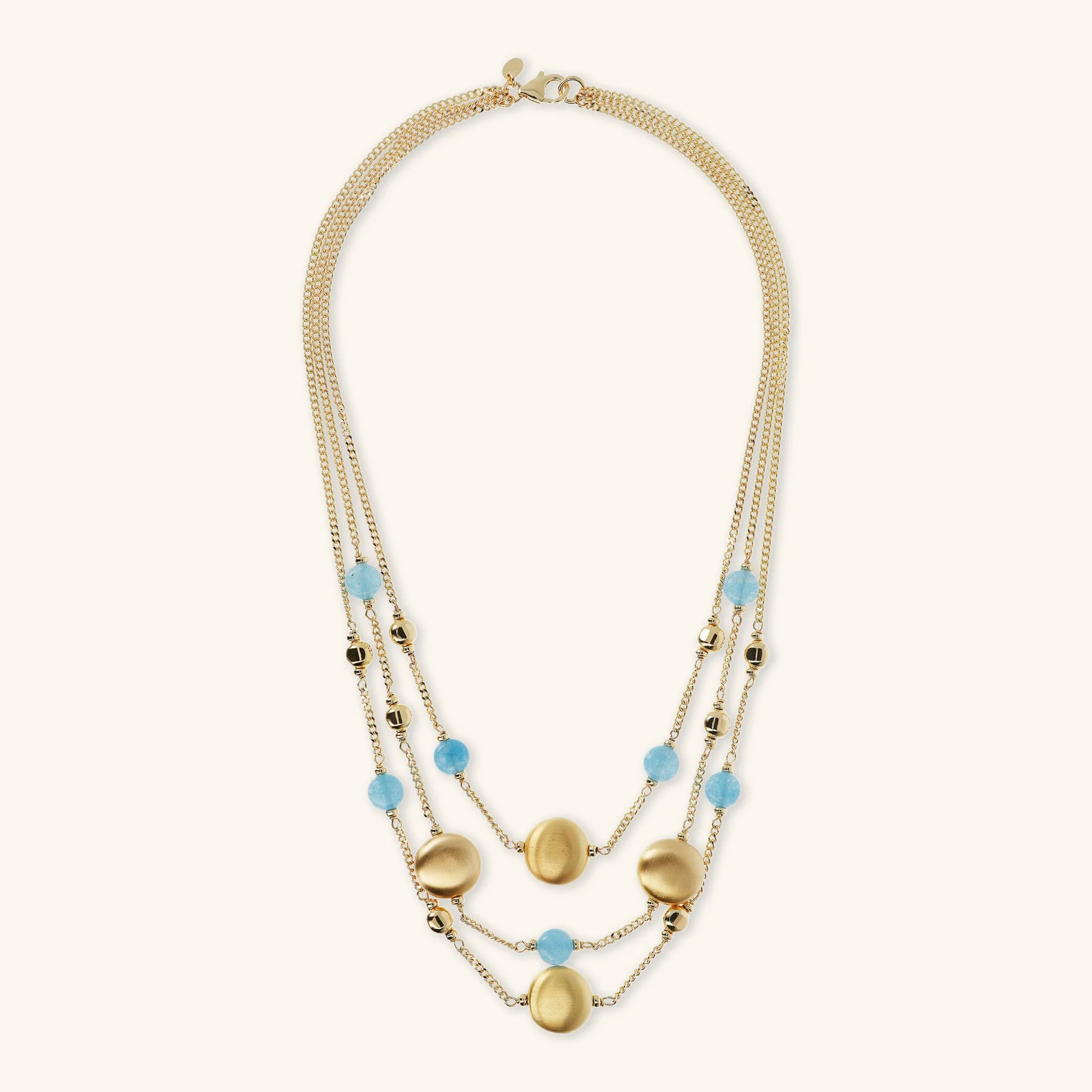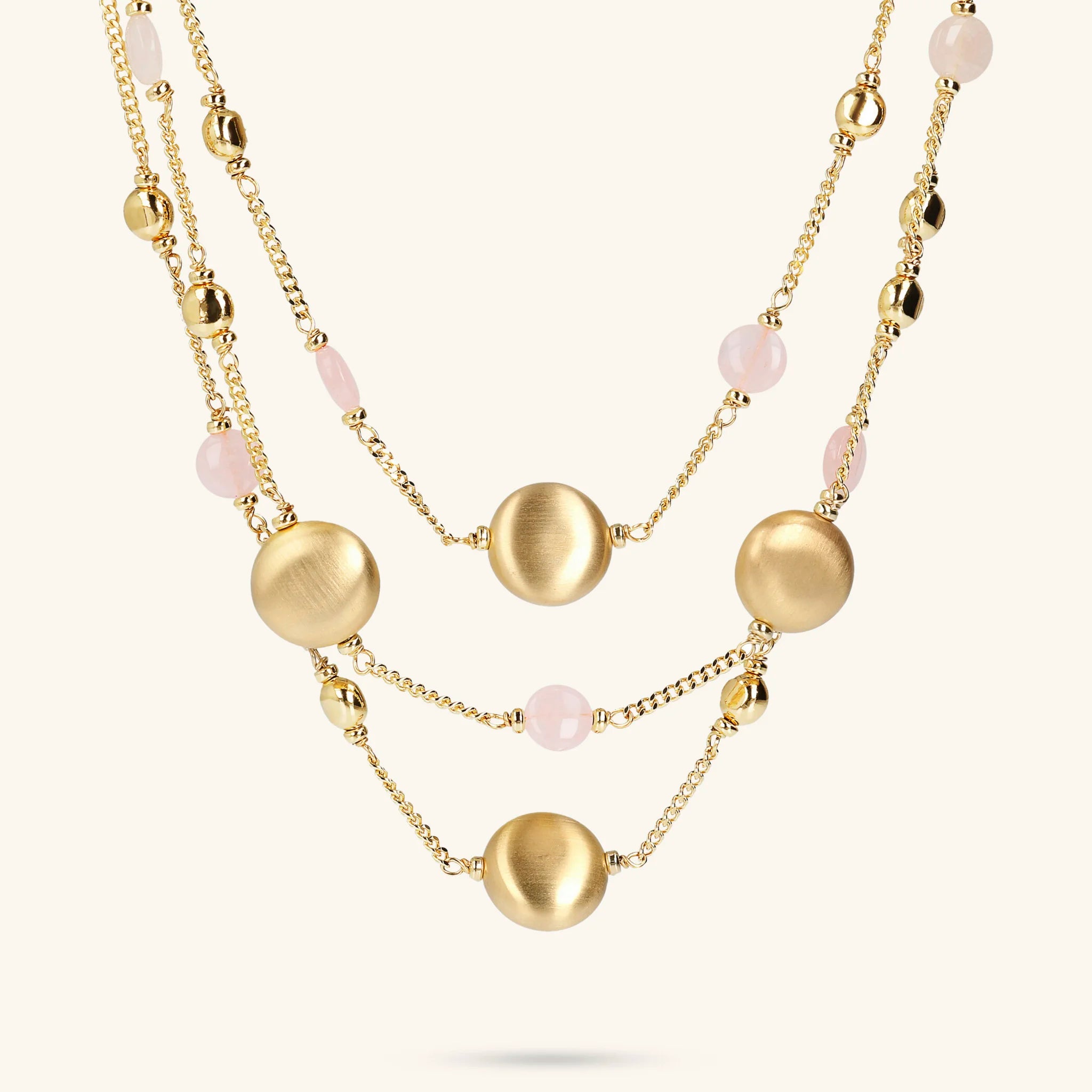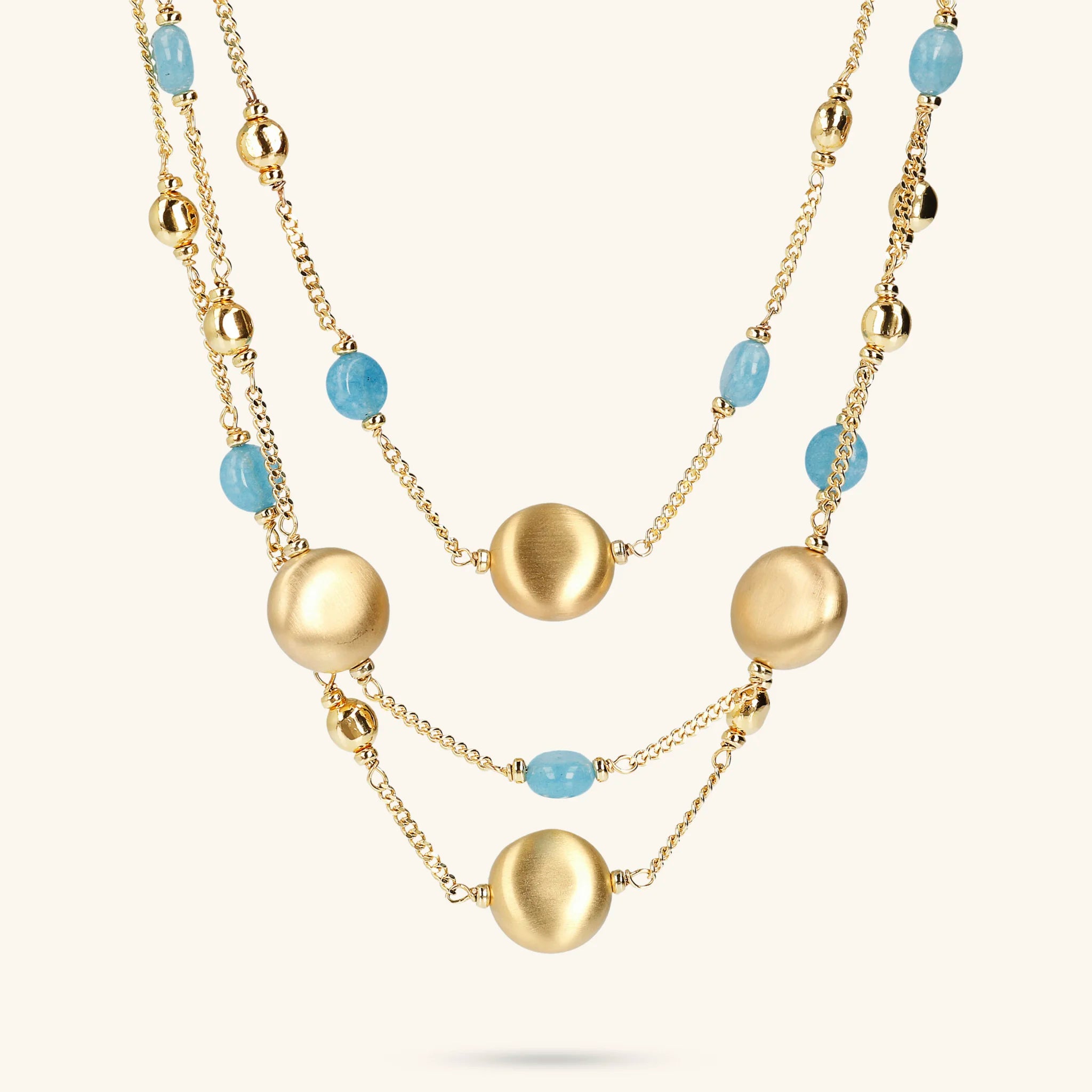Collana multi-filo Etrusca Gioielli realizzata in lega Golden, placcata oro giallo 18kt, composta da tre fili graduati: la collana più lunga e quella più corta hanno una catena grumetta impreziosita da station di sfere golden, piccole pietre naturali (quarzo celeste o rosa) e presentano un tondo con superficie satinata collocato al centro; la collana media presenta sfere golden, piccole pietre naturali (quarzo celeste o rosa) e due elementi tondi con superficie satinata collocati ai lati; chiusura a moschettone.