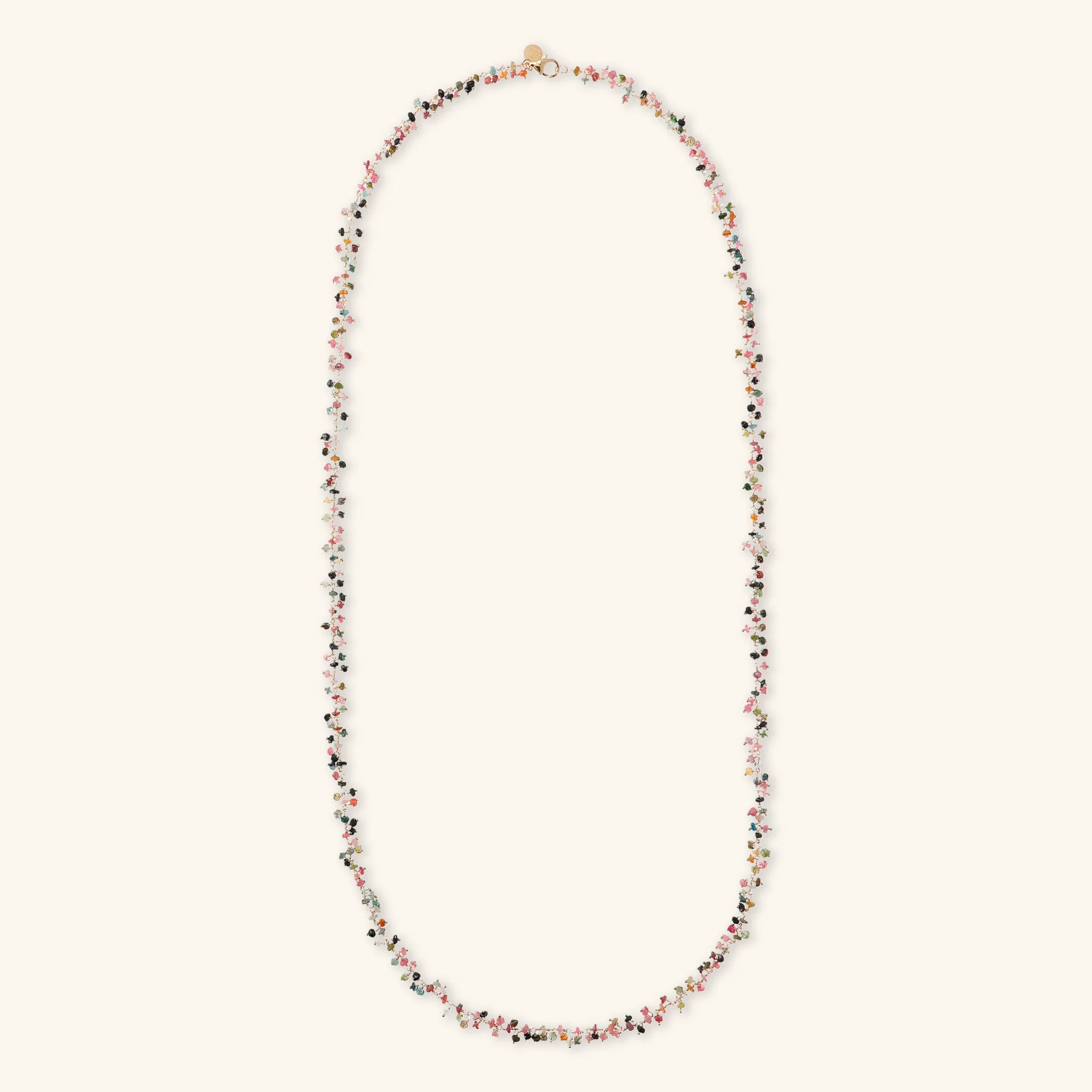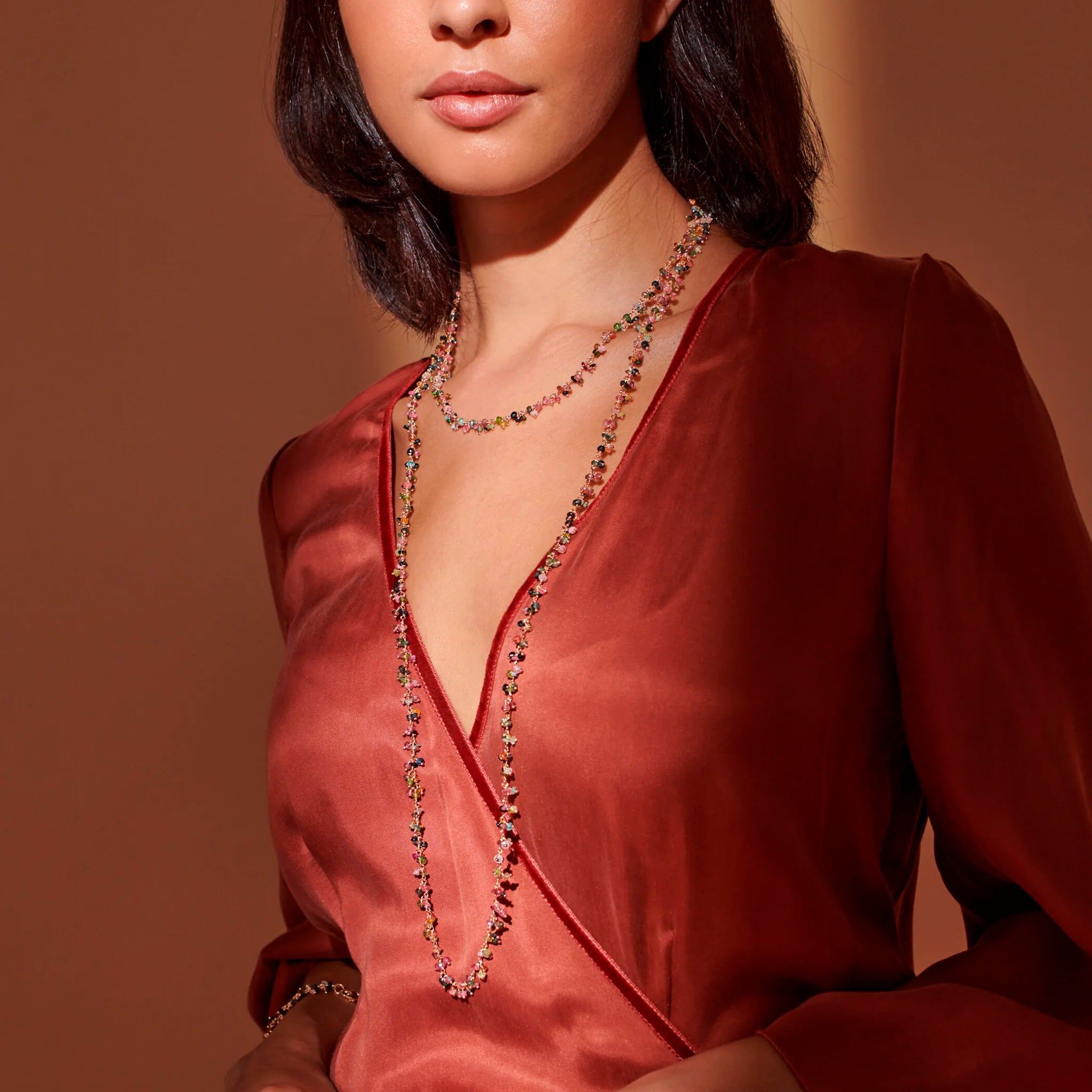 Collana rosario Etrusca Gioielli realizzata in lega Golden, placcata oro giallo 18kt, impreziosita da piccole pietre naturali, tormalina multicolore, dalla forma irregolare; chiusura a moschettone. Disponibile in due misure: short (45 cm) e long (90 cm).