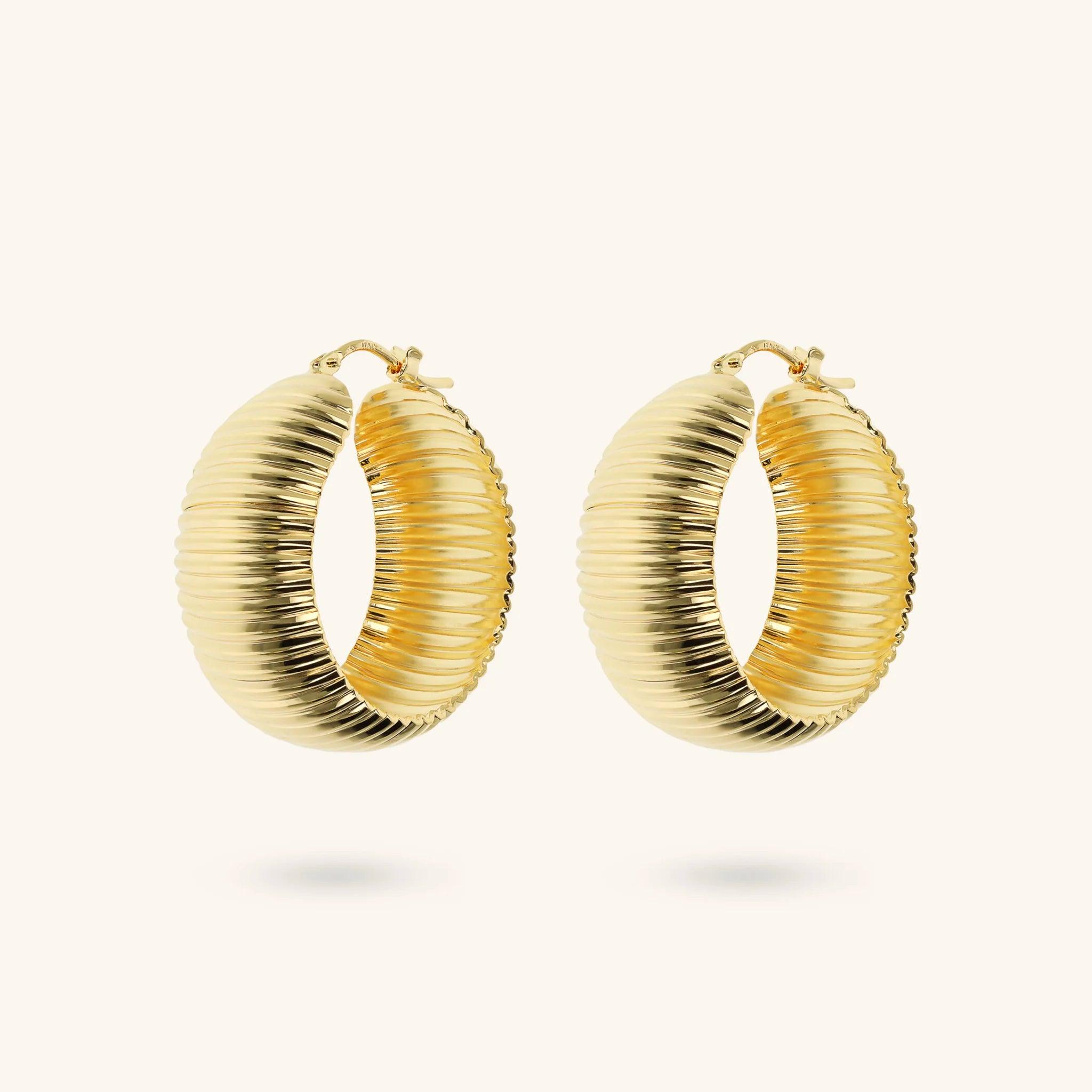 Orecchini a cerchio Etrusca Gioielli realizzati in lega Golden, placcata Oro giallo 18kt o Rodio, con superficie dalla texture rigata. Spessore 0.5mm. Chiusura a baionetta. Diametro esterno 3 cm.