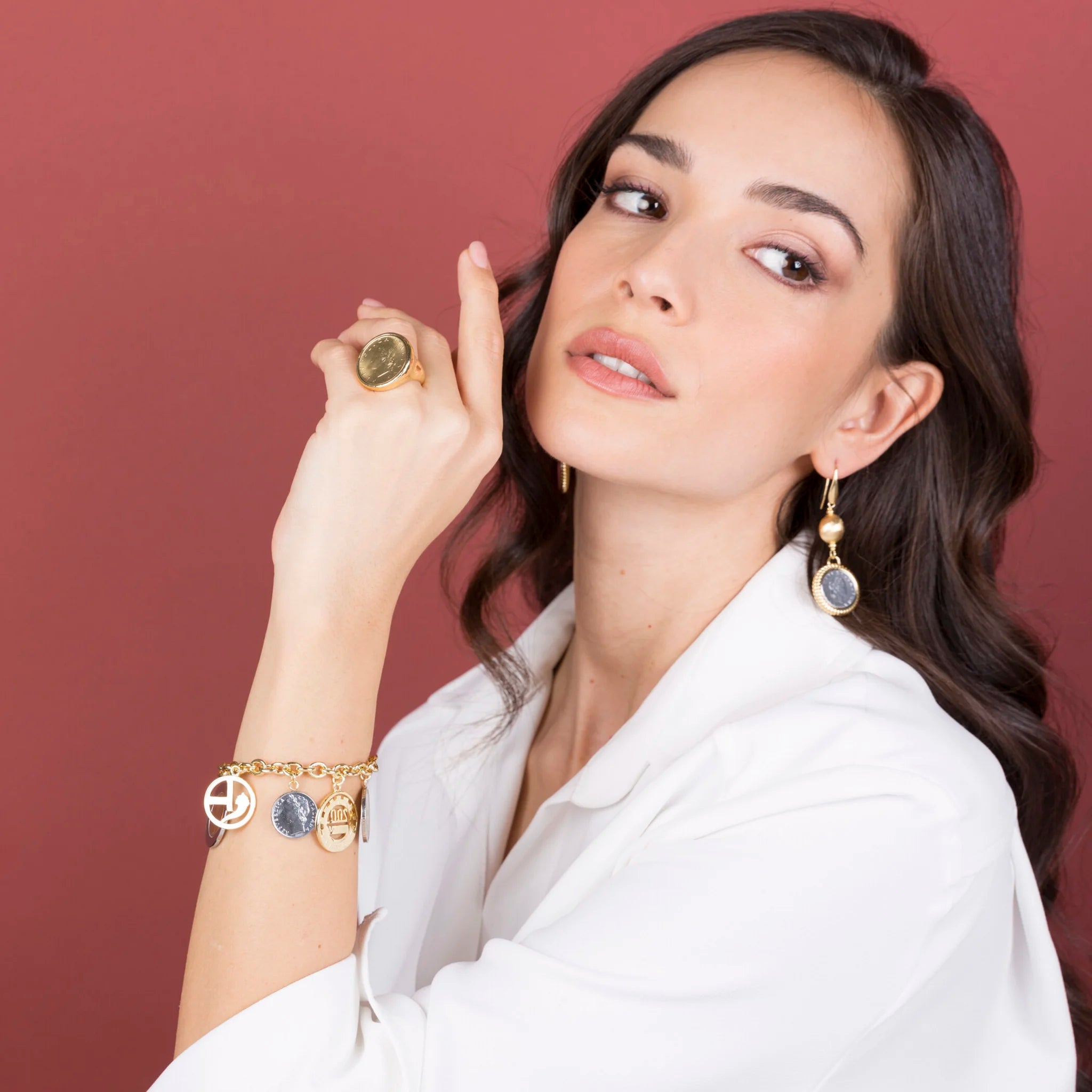 Bracciale Etrusca Gioielli realizzato in lega Golden, placcata oro giallo 18kt, con catena rolo impreziosita da quattro charms con monete repliche e tre charms con monete originali; chiusura a moschettone con extender.