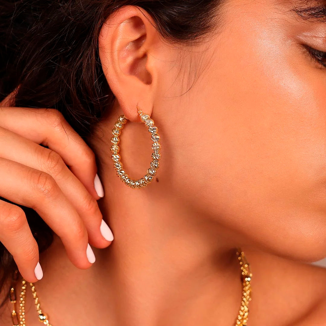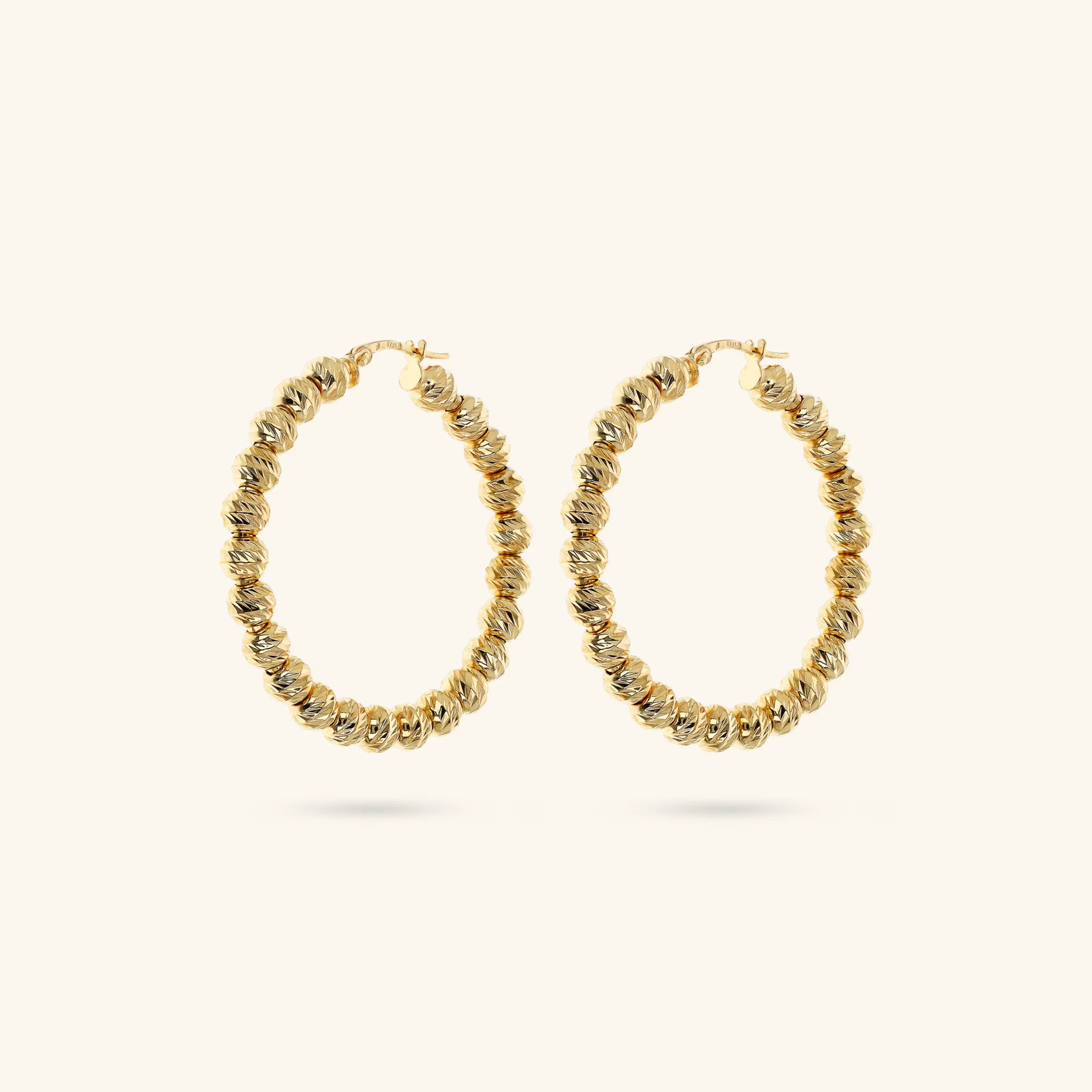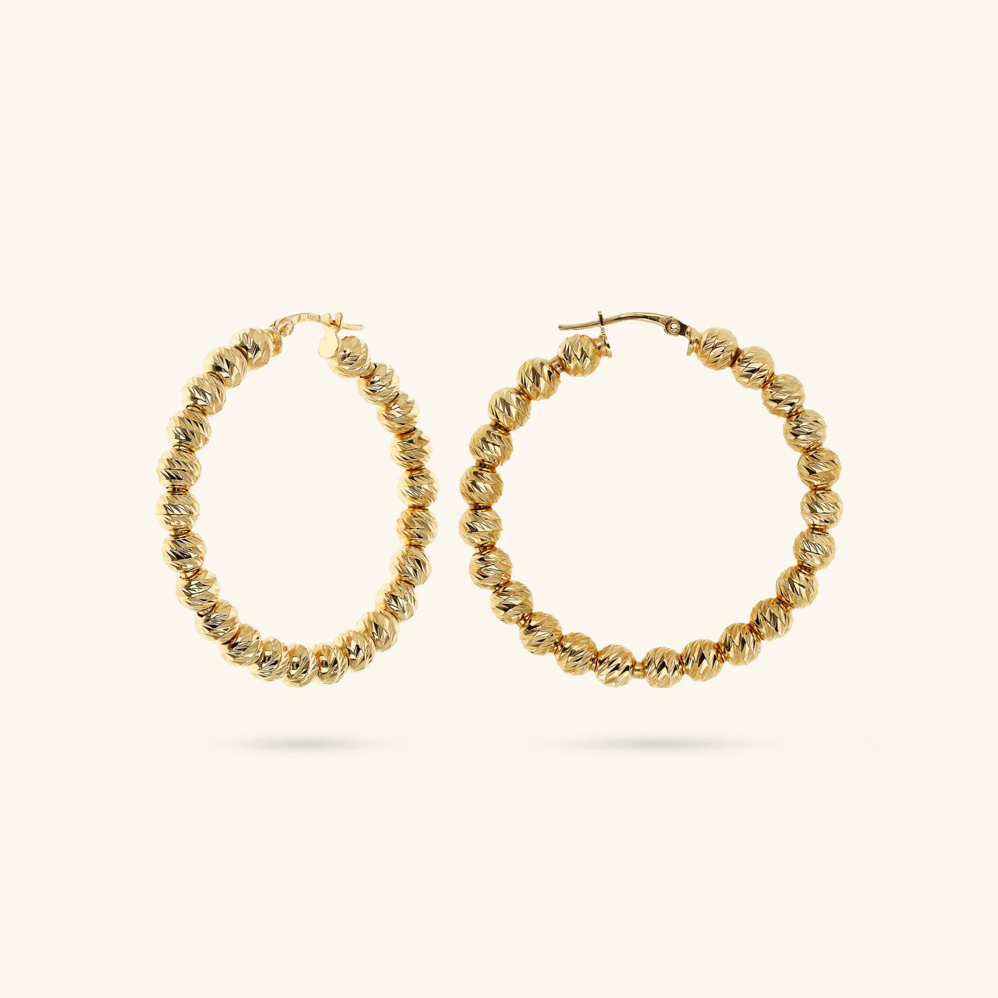 Orecchini a cerchio Etrusca Gioielli realizzati in lega Golden, placcata Oro giallo 18kt, con bead diamantate (5 mm). Chiusura a baionetta. Diametro esterno 4 cm.