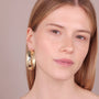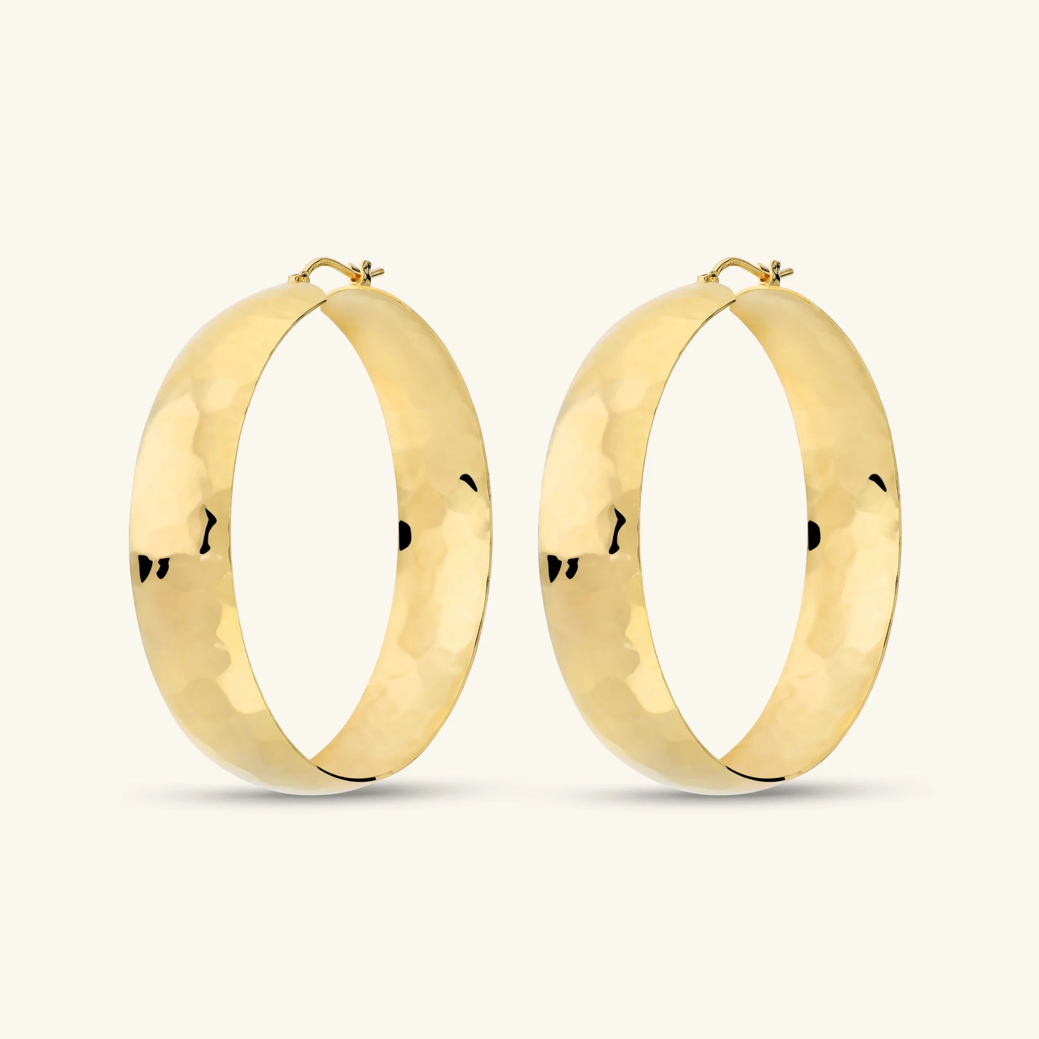 Orecchini a cerchio Etrusca Gioielli realizzati in lega Golden, placcata oro giallo 18kt, con superficie leggermente martellata. Chiusura a baionetta. Diametro esterno 5 cm.