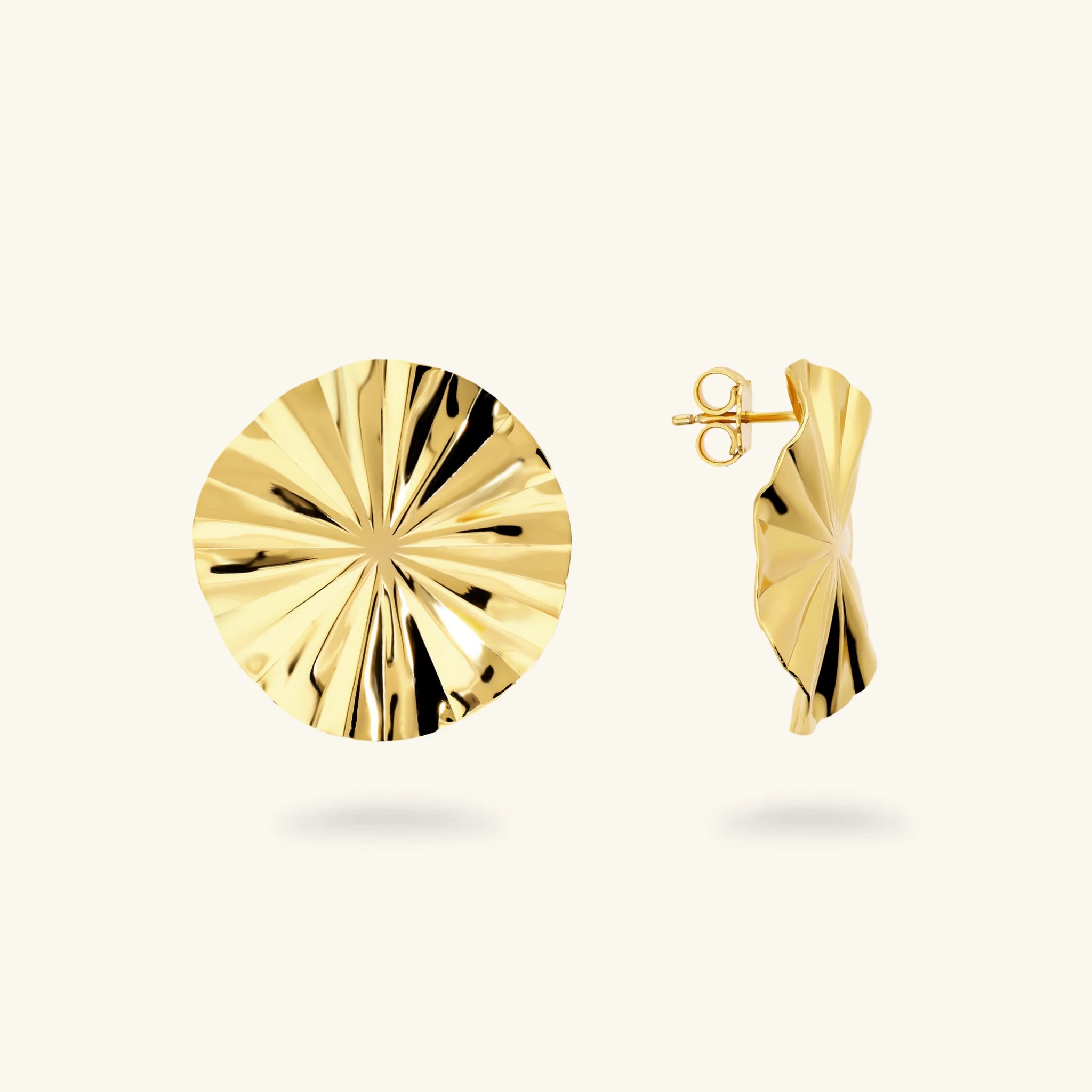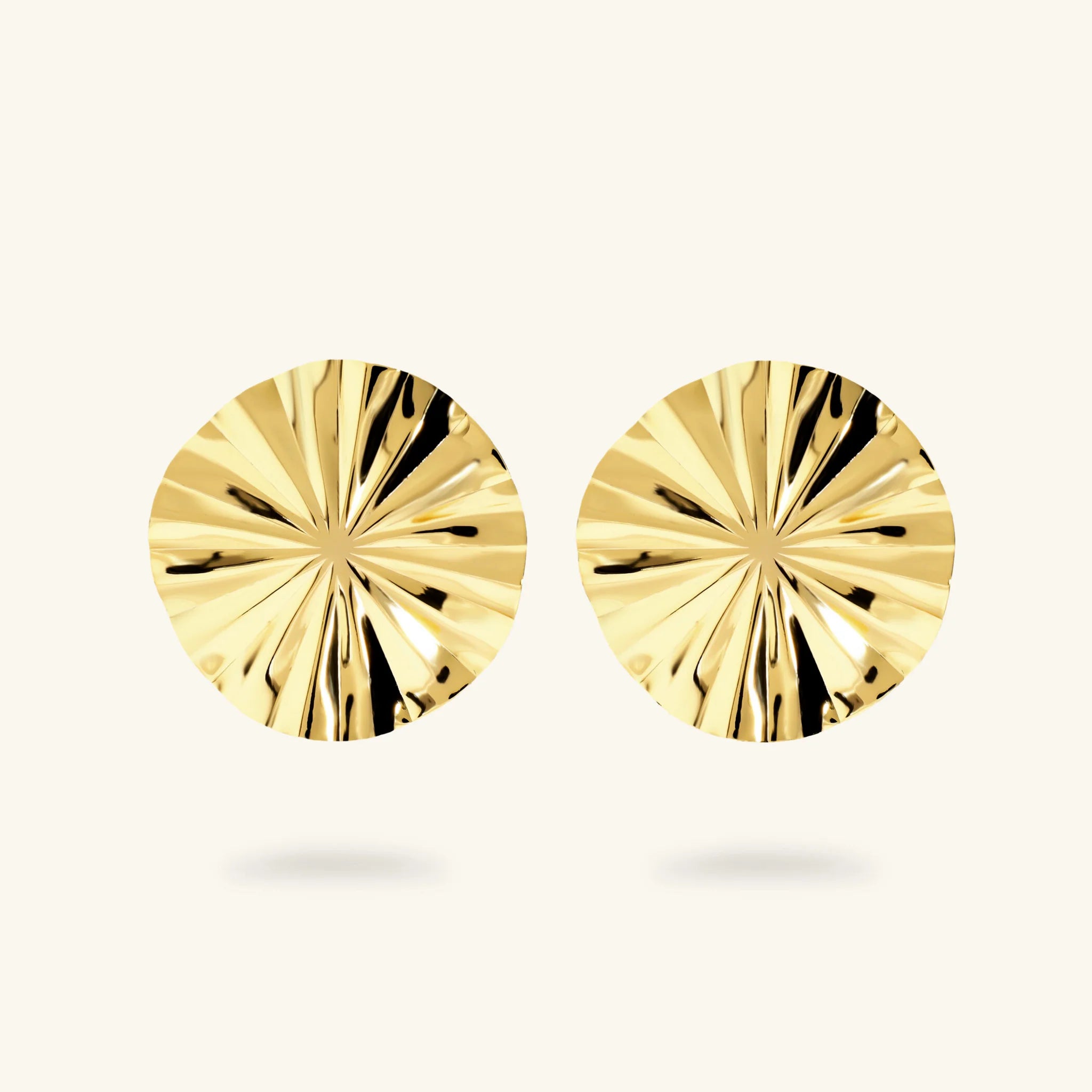 Orecchini a disco Etrusca Gioielli realizzati in lega Golden, placcata Oro giallo 18kt, con finitura diamantata e lavorata. Chiusura a perno e farfalla.