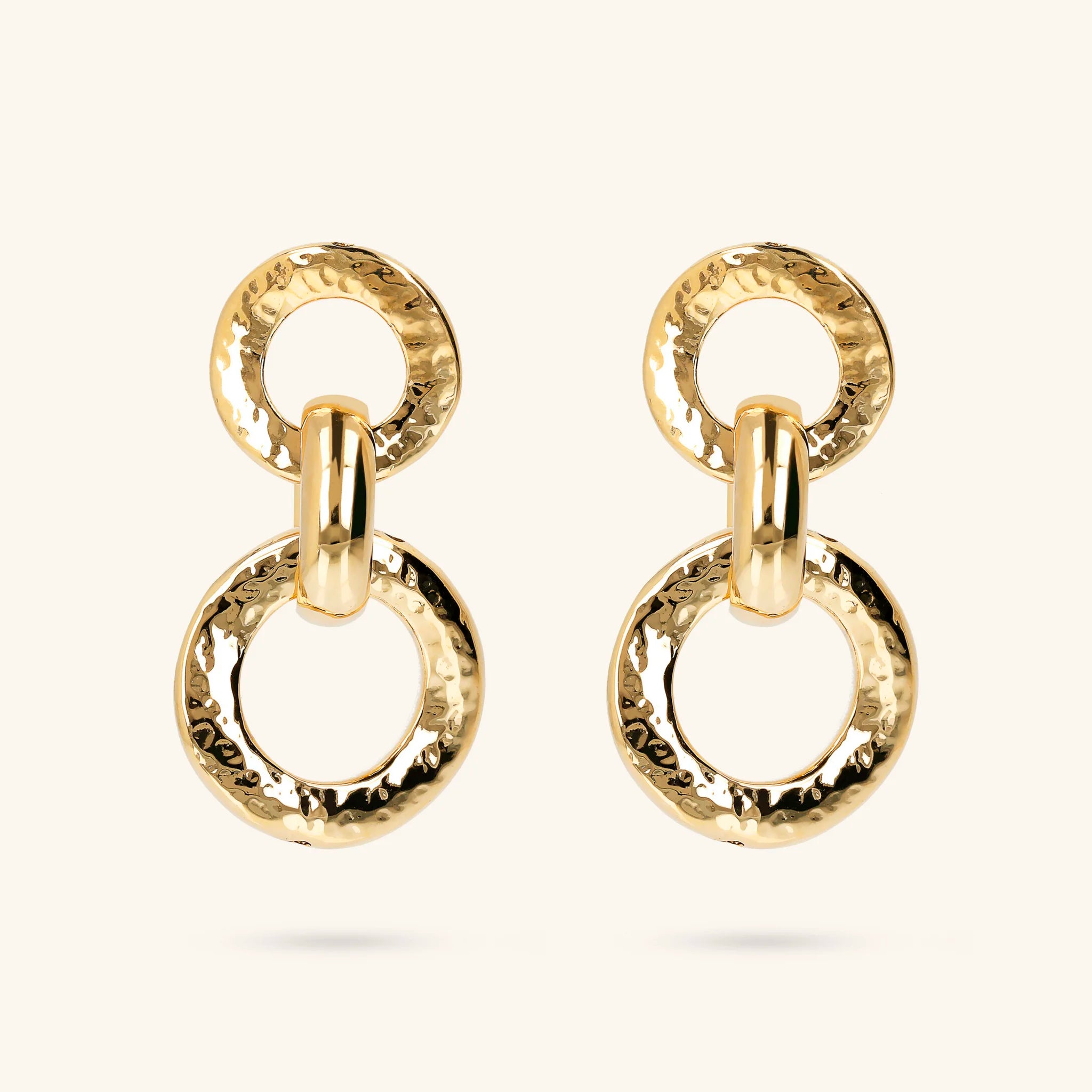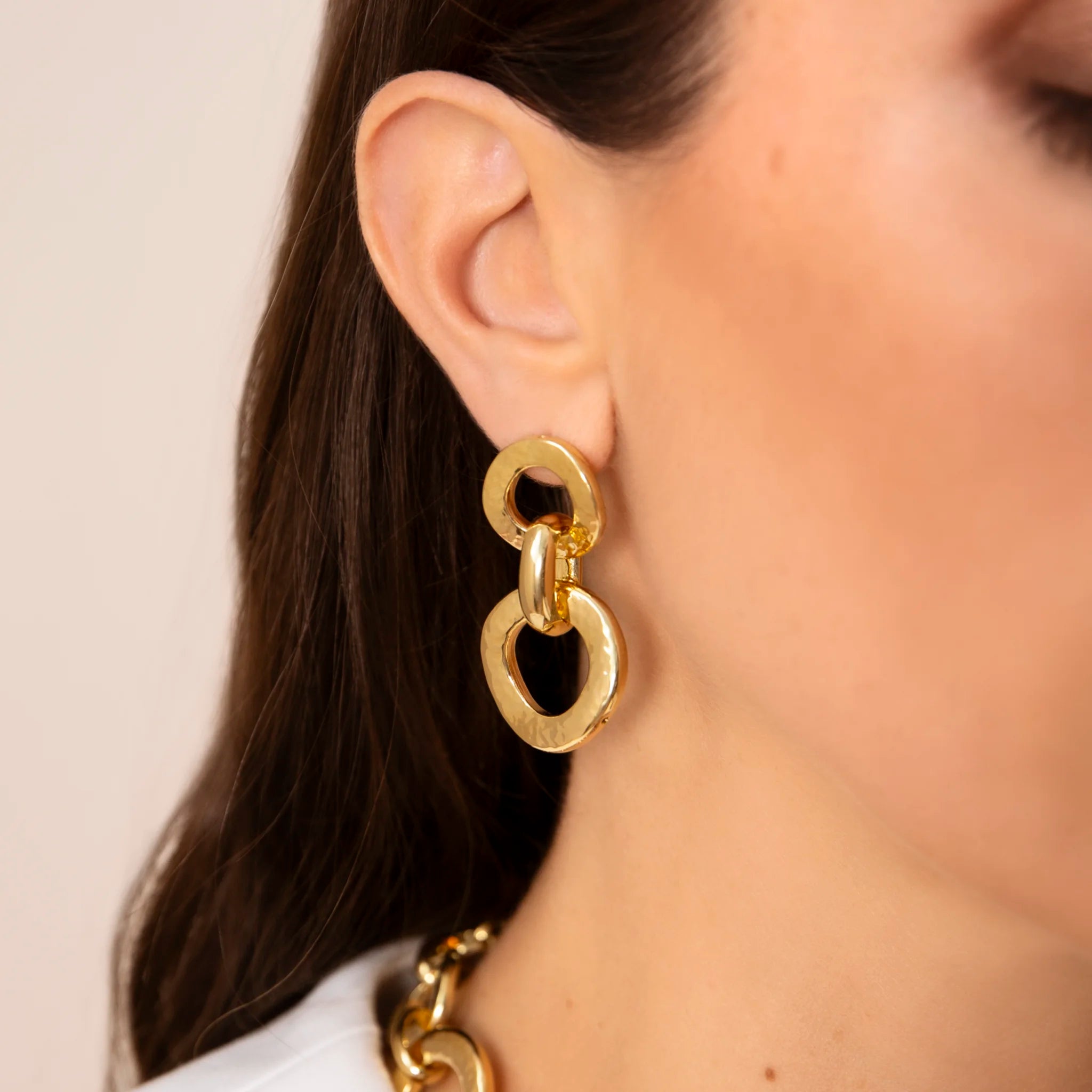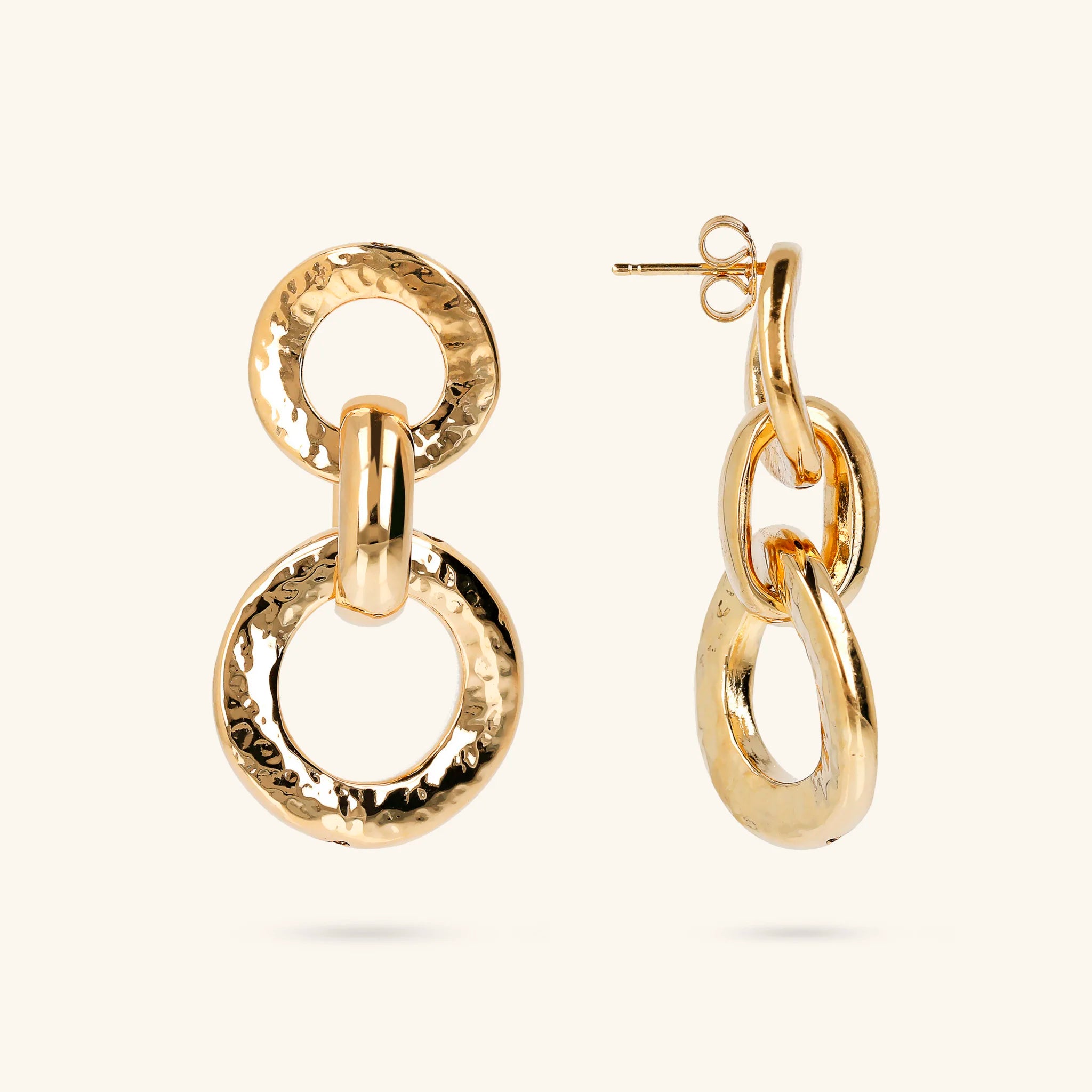 Orecchini pendenti Etrusca Gioielli realizzati in lega Golden, placcata oro giallo 18kt, impreziositi da maglie ad anelli martellati tenuti insieme da una rondella ovale con superficie liscia; chiusura a perno e farfalla.